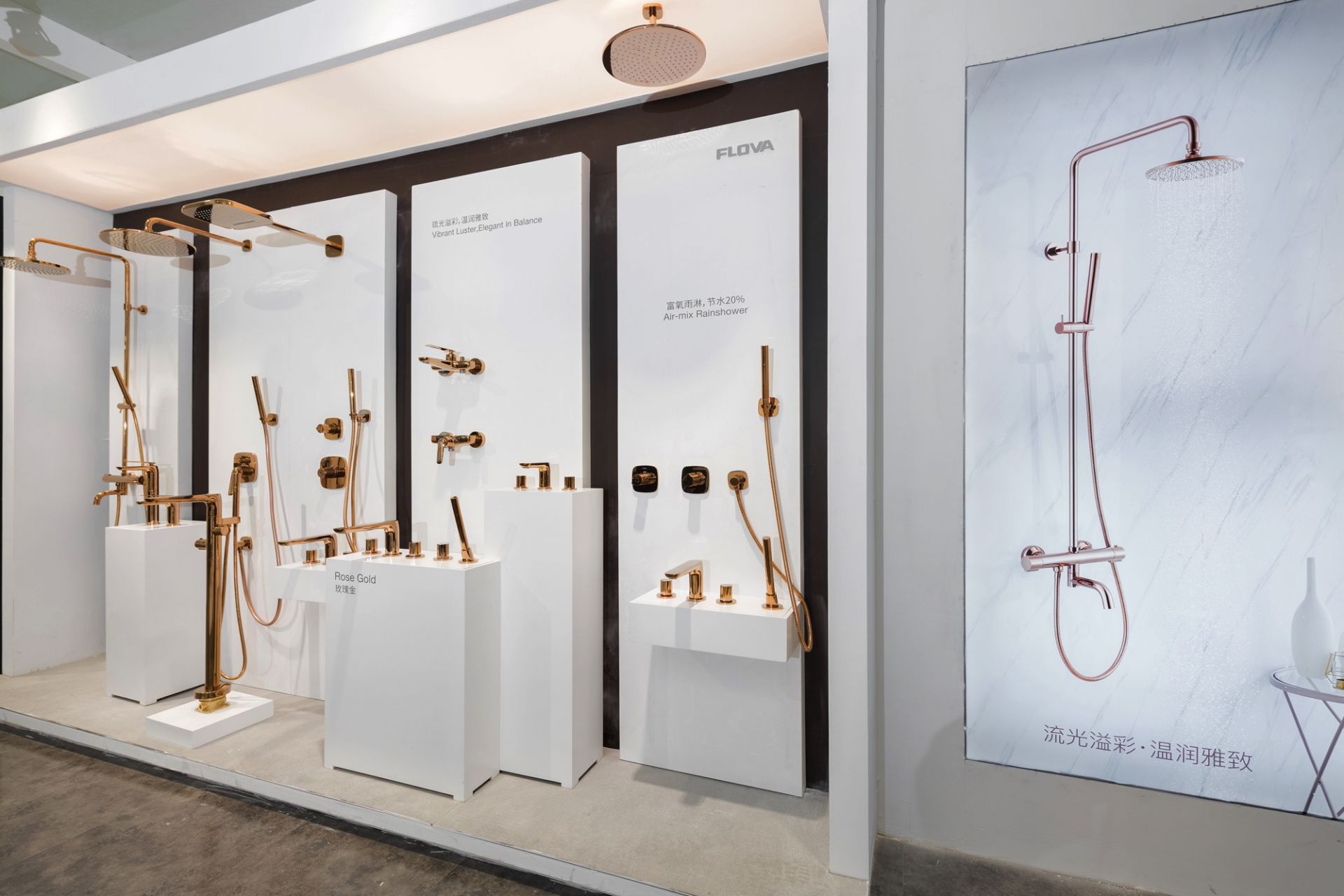 FLOVA攜眾多表面處理技術:玫瑰金、啞光?、紅古銅、拉絲金、光亮鉻等,??彩彰顯獨特的設計品味,讓浴室充滿個性化選擇。